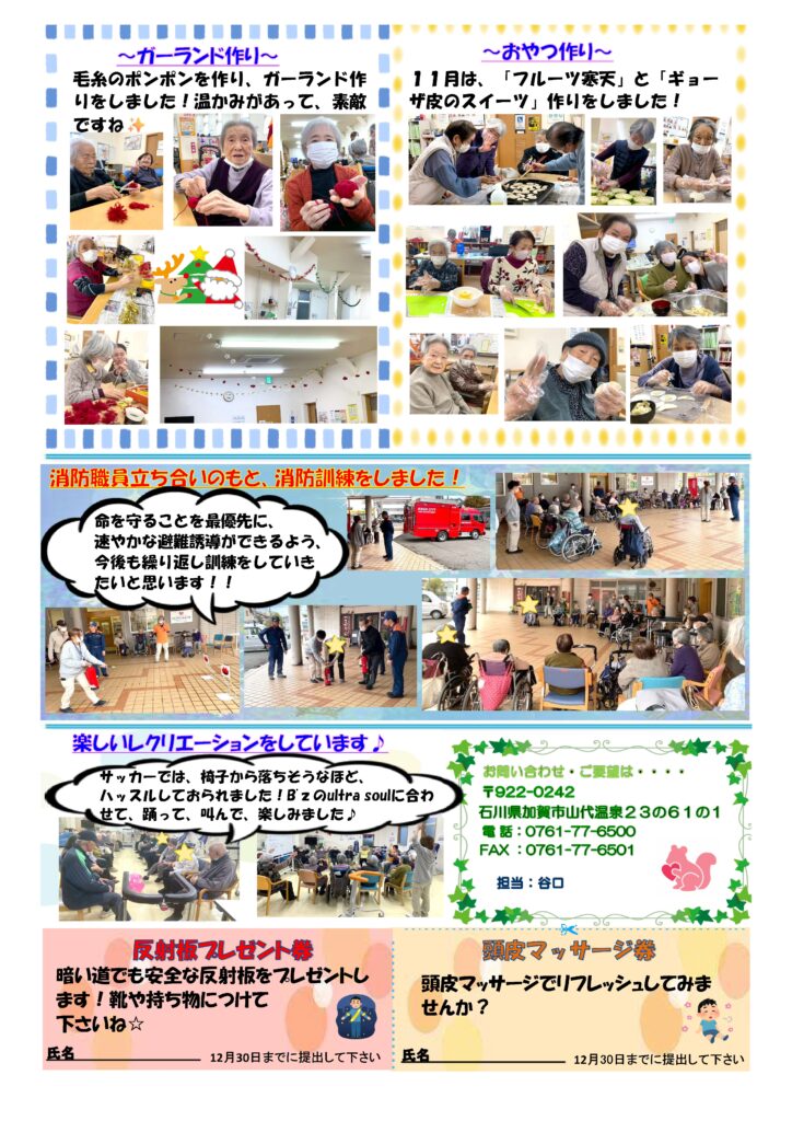 冬のお食事会、ガーランド作り、リハビリと余暇活動の様子などを載せています