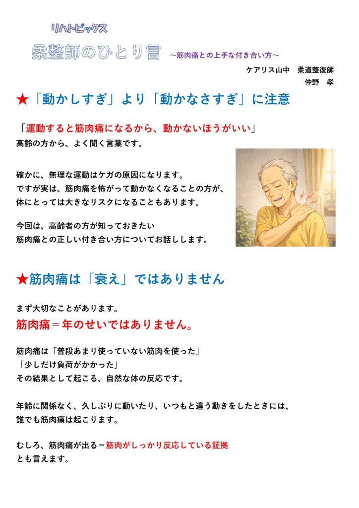 地域密着型通所介護ケアリス山中の柔道整復師 仲野 孝 が「柔整師のひとり言」として