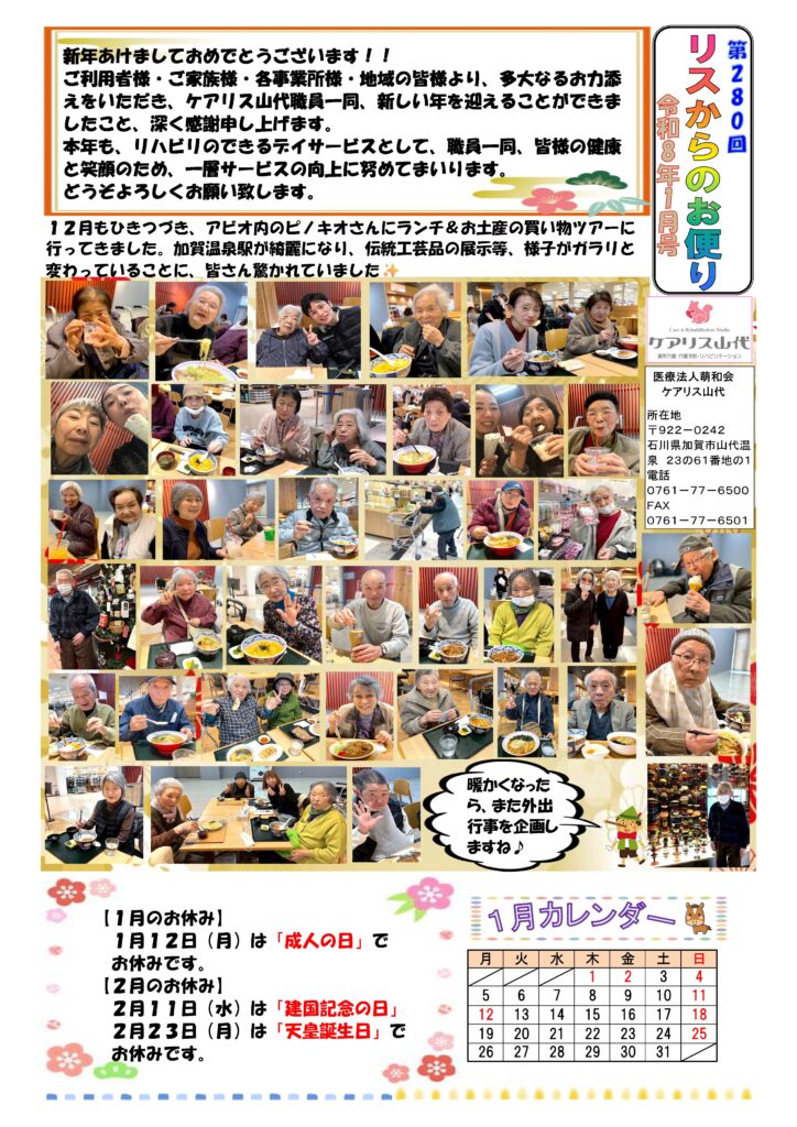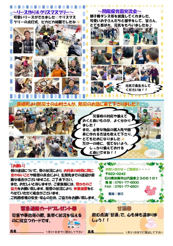 お食事会、クリスマスリース作り、園児との交流会、リハビリと余暇活動の様子などを載せています